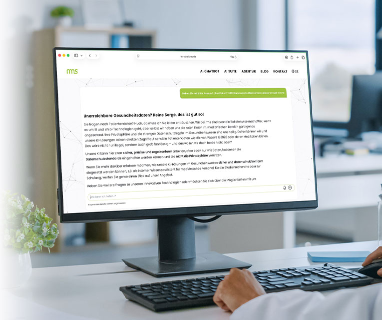 Der rms. AI Chatbot unterstützt Unternehmen im Gesundheitswesen und in den Life Sciences dabei, Wissen effizient zu nutzen, Prozesse zu entlasten und Mitarbeitende zu stärken – und das ohne Kompromisse bei Datenschutz, Compliance oder Patientensicherheit.