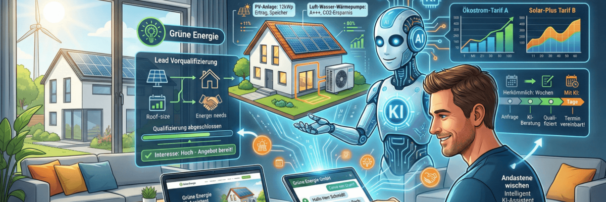Er fungiert als digitaler Vertriebsassistent, der Leads vorqualifiziert, komplexe Produkte (PV, Wärmepumpen, Tarife) erklärt und den Vertriebszyklus verkürzt.