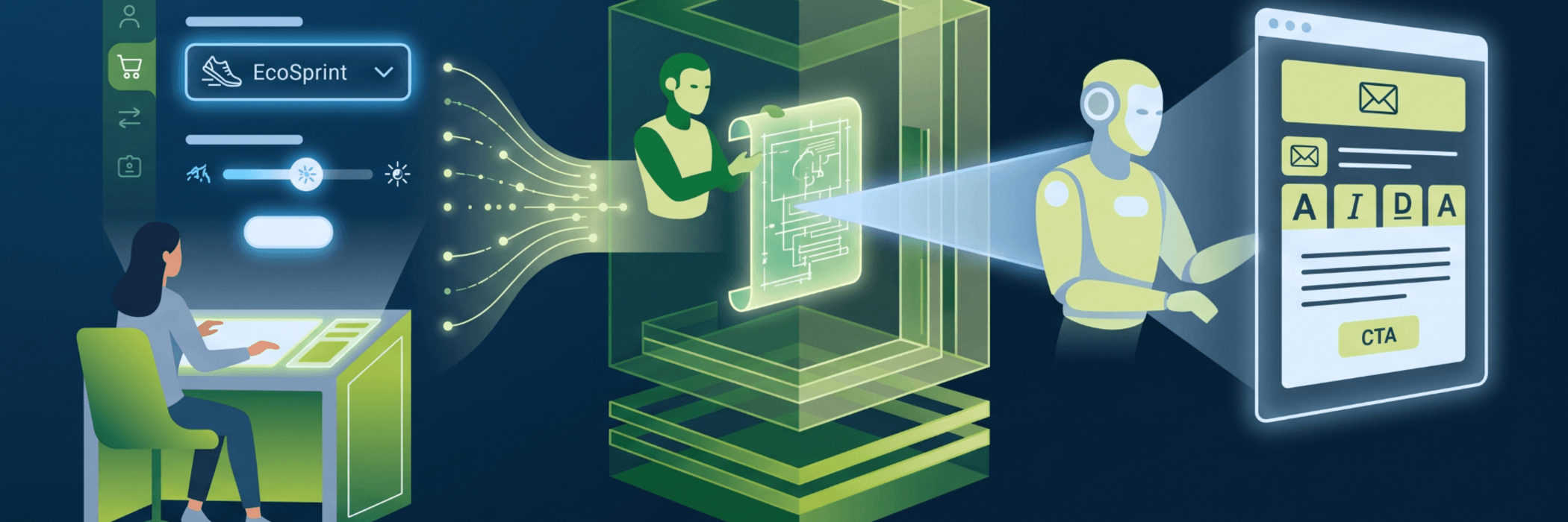 - Produkt: Über ein Dropdown-Menü wählt sie den „EcoSprint“ aus. Der AI Hub ist mit dem PIM-System (Produktdatenbank) des Unternehmens verknüpft und zieht sich im Hintergrund automatisch alle relevanten Spezifikationen (z.B. „100 % Ozeanplastik“, „ultraleicht“).