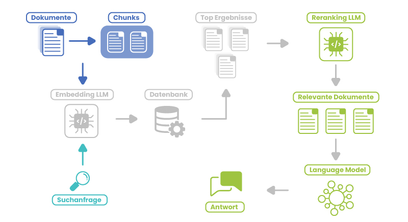 Reranking (auch Cross-Encoding genannt) reduziert die vom Retriever gefundenen Dokumente auf die wirklich relevanten Inhalte.