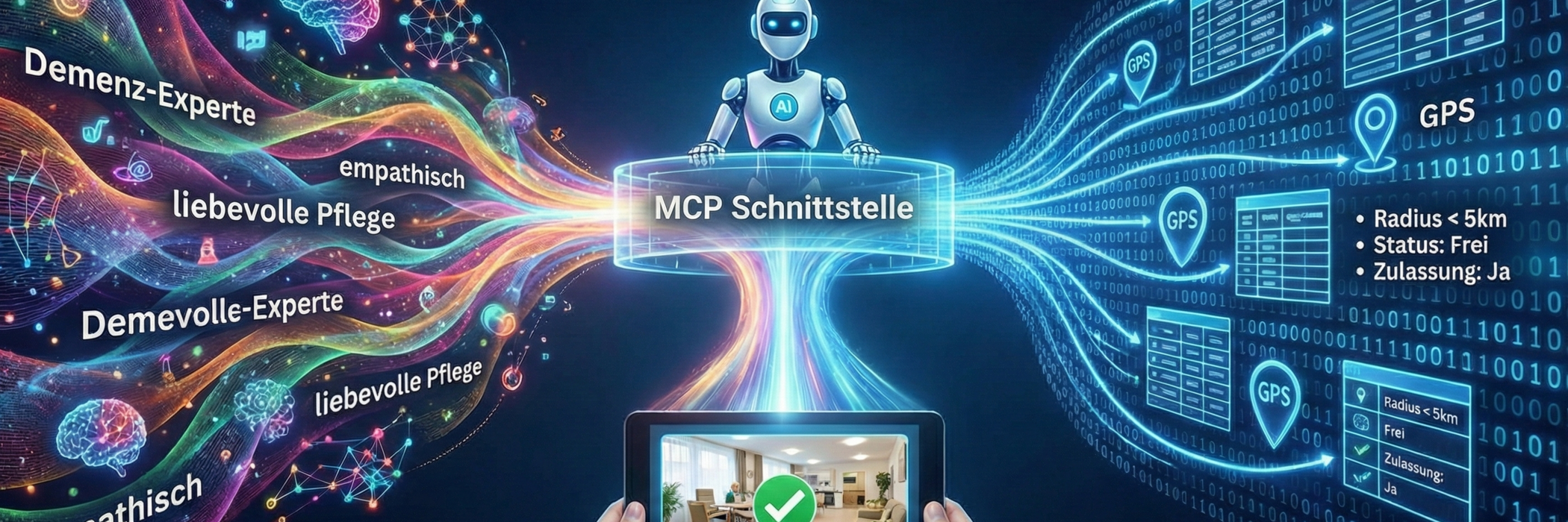 - Schritt 2: Der Live-Check. Über MCP fragt die KI in Echtzeit die Live-Datenbanken der Pflegeeinrichtungen ab. Sie prüft nicht nur die Entfernung per GPS, sondern den tatsächlichen Belegungsstatus in der Sekunde der Anfrage.