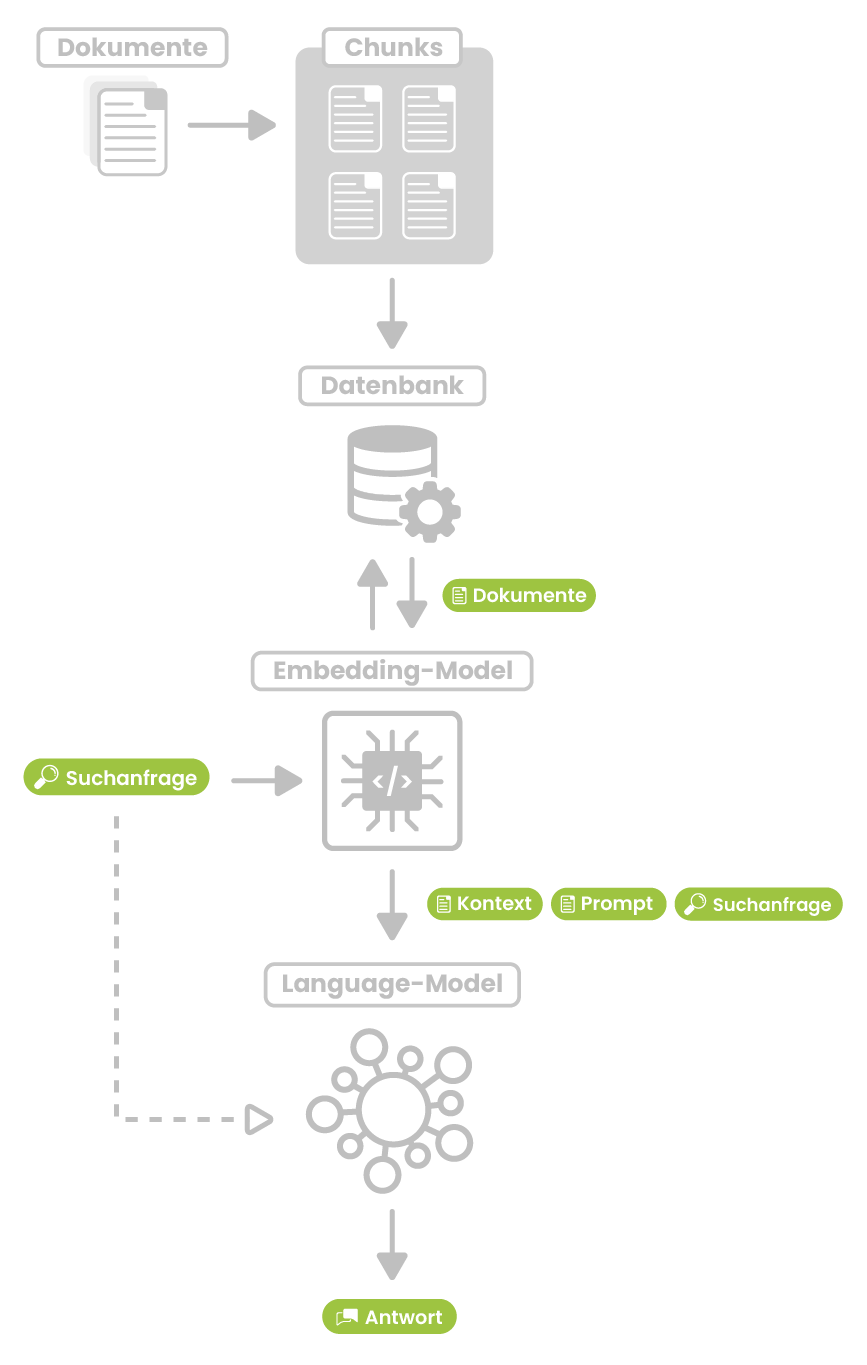 Die Vektordatenbank wird mit dem Fragevektor abgefragt, um die semantisch ähnlichsten Dokumente oder Textpassagen zu finden.
