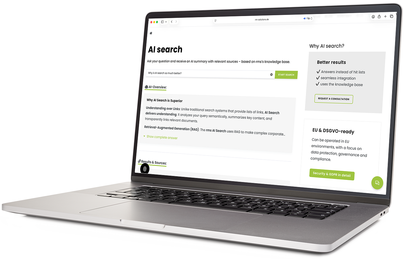 rms AI Search has been developed for professional use in companies with high data protection, compliance and information security requirements. Your content remains under your control at all times - technically, organizationally and legally.