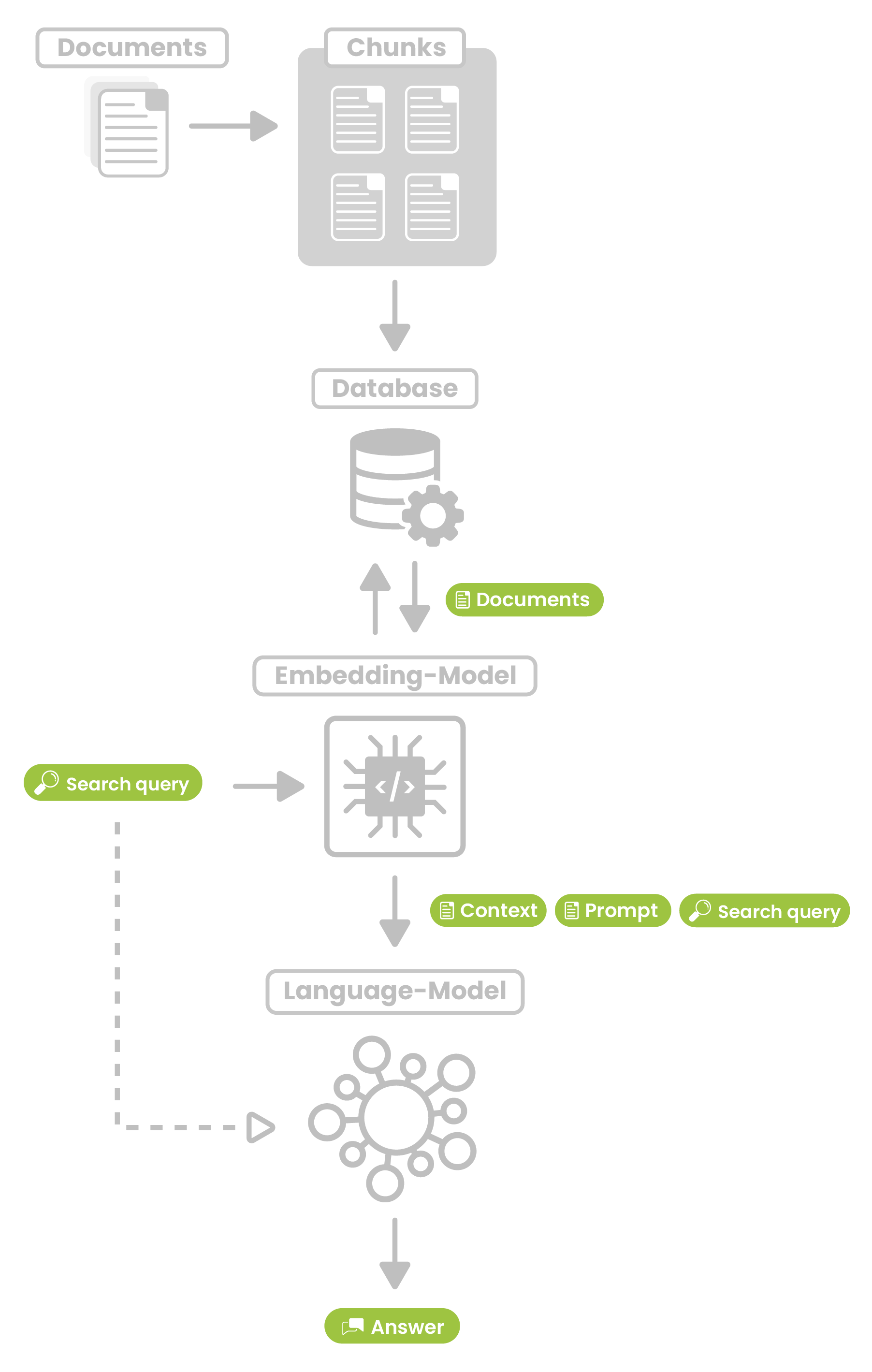 The original question, the documents found and a prompt (task) are transferred to the language model (LLM).