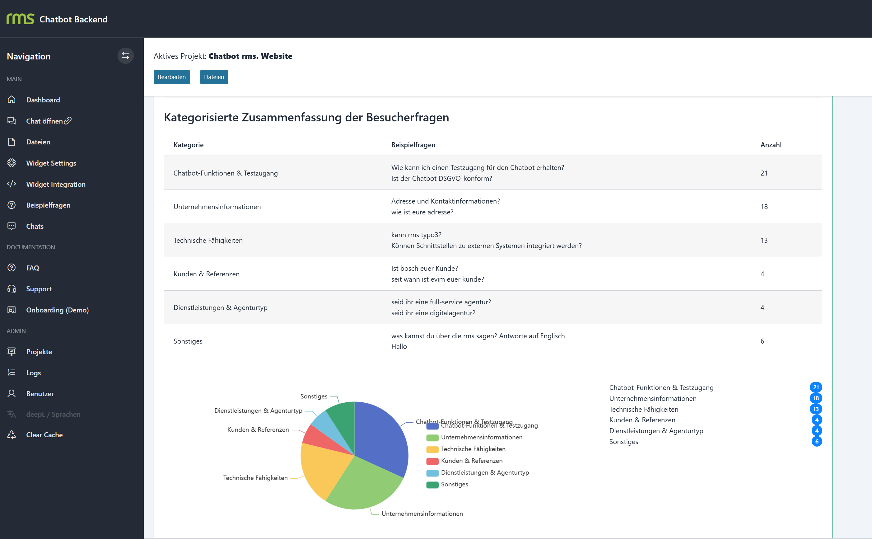 Wünschen Sie sich, dass Kundenanfragen auf Ihrer Webseite rund um die Uhr beantwortet werden? Haben Ihre Mitarbeiter Schwierigkeiten, schnell die richtigen Informationen in internen Dokumenten zu finden? Unser KI-Chatbot beantwortet Fragen zu Ihren Produkten sofort und präzise. Der rms. KI-Chatbot beantwortet Fragen ganz konkret zu ihren unternehmens- bzw. themenspezifischen Inhalten. Im Vergleich zu einer klassischen Suche können die Eingaben echte Fragen sein. Die zugrunde liegenden Daten können komplette Webseiten, PDFs, Word-Dateien, Textdokumente oder Exporte aus Datenbanken sein. Auch eine Kombination aus mehreren Quellen ist möglich.